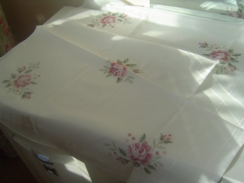 Lovely vintage style table cloth features cross stitch floral pattern on white cotton fabric. Nice and neat in white base. Old time charm. Disappearing with time goes....../ Vintage Hand cross stitch roses Table Cloth52"x72" / vinyl tablecloth
