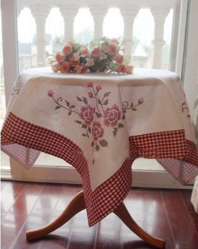 intage Hand Cross stitch Roses Cotton Table Cloth C-1-2011-02,C-2-2011-03 You are so lucky to have this hand corss stitch decorated beautiful table cloth. It has cross stitch roses on four corners. The red gingham patched around the edge. It is made with cotton in white base. Brand new. Size :Please choose above variation. 100% cotton. New..../ Vintage Hand Cross stitch Roses Cotton Table Cloth / vinyl tablecloth